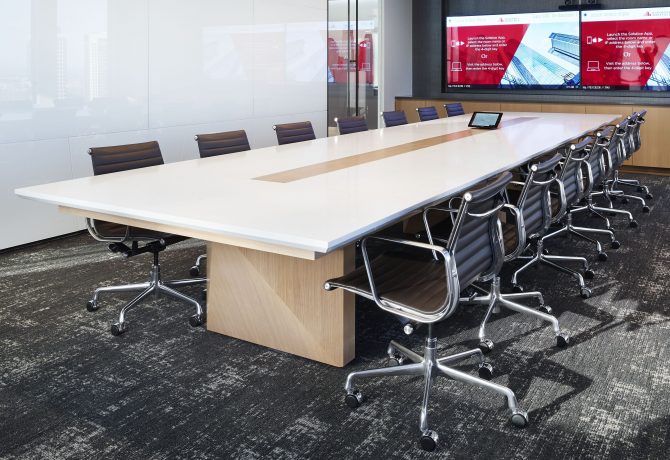 CCN supplied Conference Tables and Credenzas for this major real estate broker for their corporate headquarters. A unique faceted aesthetic was employed throughout as evidenced in the table bases, the sort of technically challenging endeavor at which CCN excels.