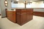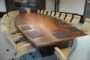 The Boardroom Table features a BARRINGTON edge with apron to permit integration of Power/Data drawers. A brushed stainless inlay separates the Cherry field from the central sketch pattern Makore inlay. Admin. Stations have solid Cherry raised panels in combination with waterfall Makore Bow Fronts and Quartz Transaction Surfaces.