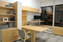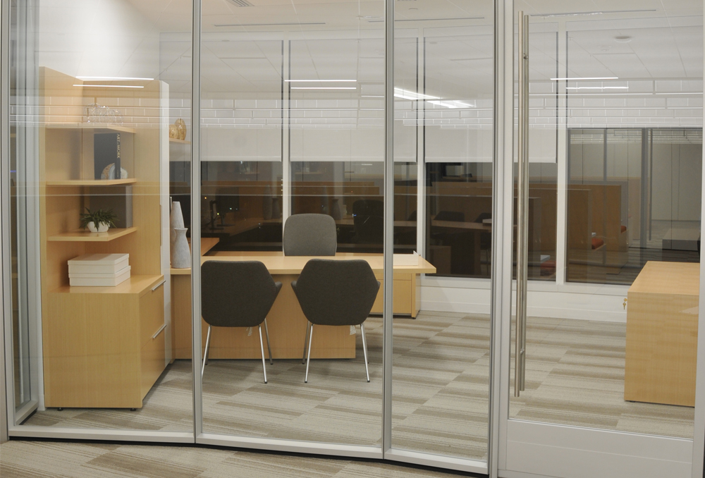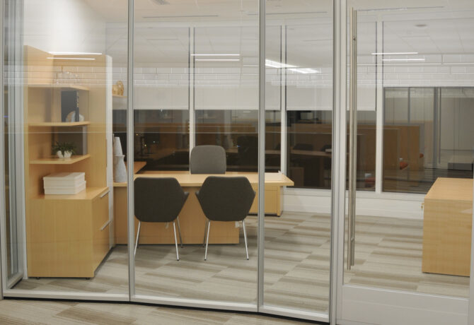 A clear finish on white birch Linea veneer is complimented by white painted casegood elements. White back-painted glass marker boards in the private offices and white laminate work surfaces on the administrative stations further the refined aesthetic. In keeping with CCN’s industry leading fabrication methods, all casegoods are constructed with mitered corners. Drawers have routed-in pulls and shelves in the Private Offices are cantilevered with steel brackets invisibly pocketed into them.