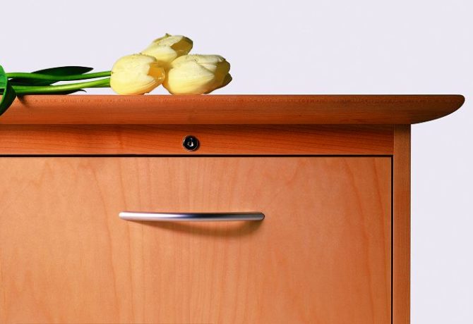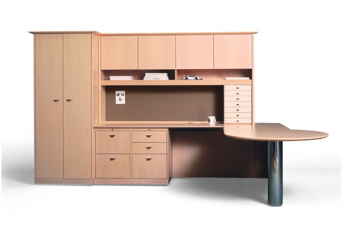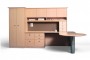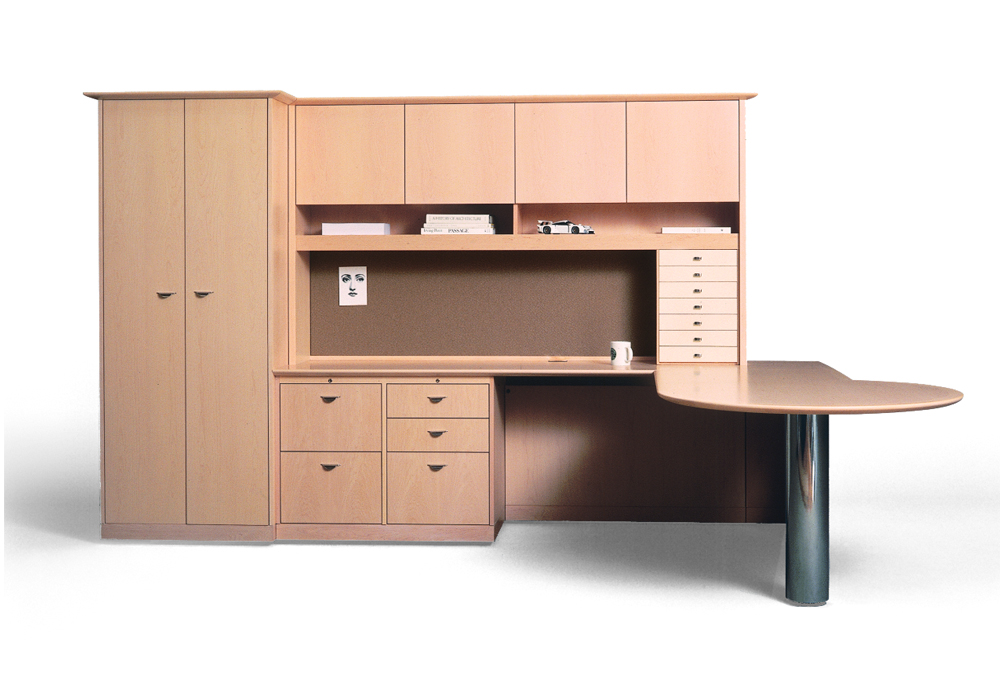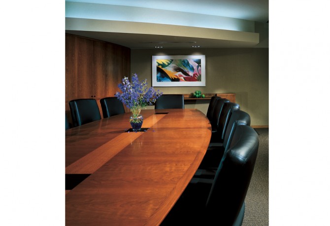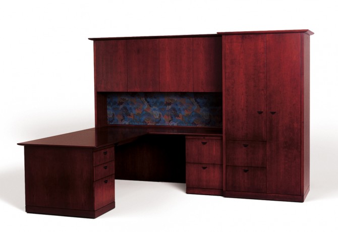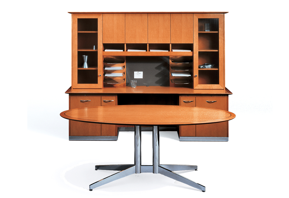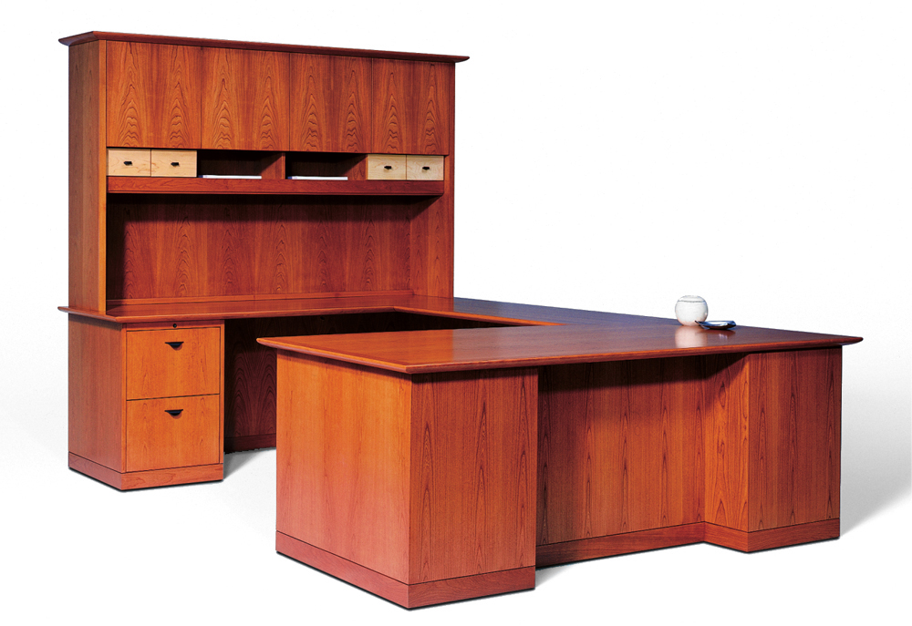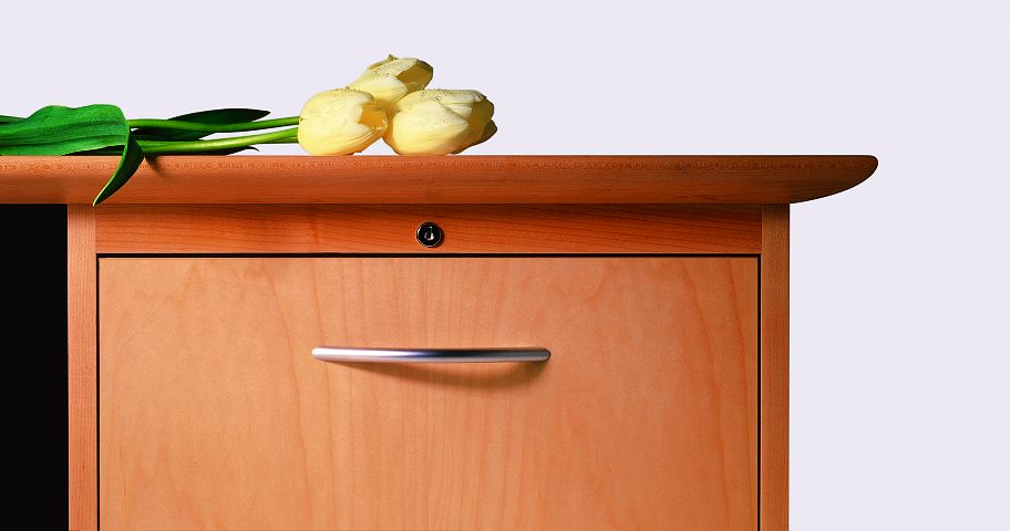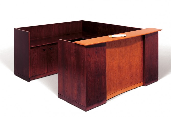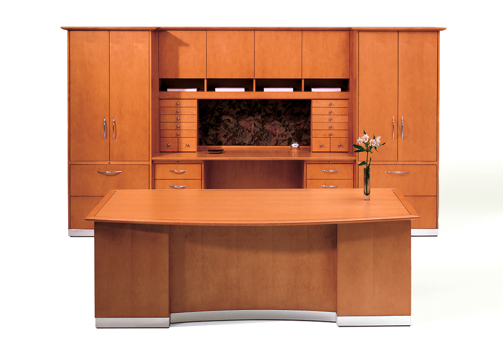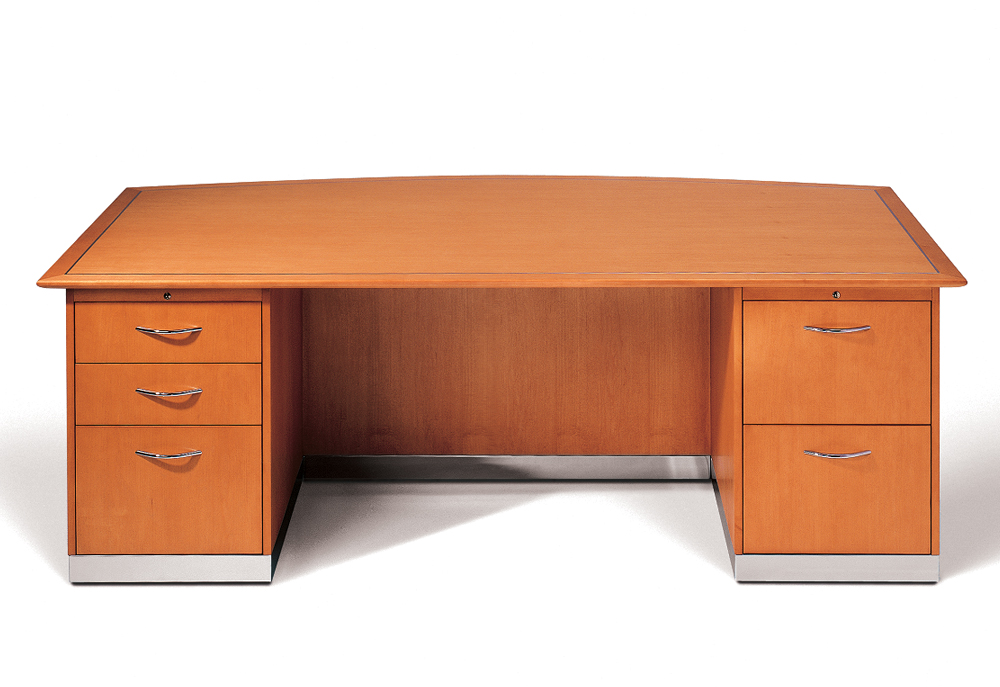A contemporary platform featuring a 1.25 in. thick cantilever edge with a 2 in. projection, CHARISMA is well suited to many contemporary office environments. Edges are softened with a .2 in. radius and the underside is gently elliptical in shape. Tops are mitered at all corners and the profile appears on all edges. Worksurfaces are supported by square cornered pedestals with a flush 2.75 in. high solid hardwood base. An arc segment pull in polished chrome, satin silver, or black is standard.